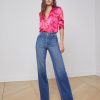 A beautifully proportioned wide-leg high-rise jean in white premium stretch denim. Contoured waistband fits securely at or below natural waist, while supple stretch denim hugs the hip before releasing into a wide leg. Classic five-pocket construction and front zip fly closure with tonal button. Style No. 2790KBO-BLAN