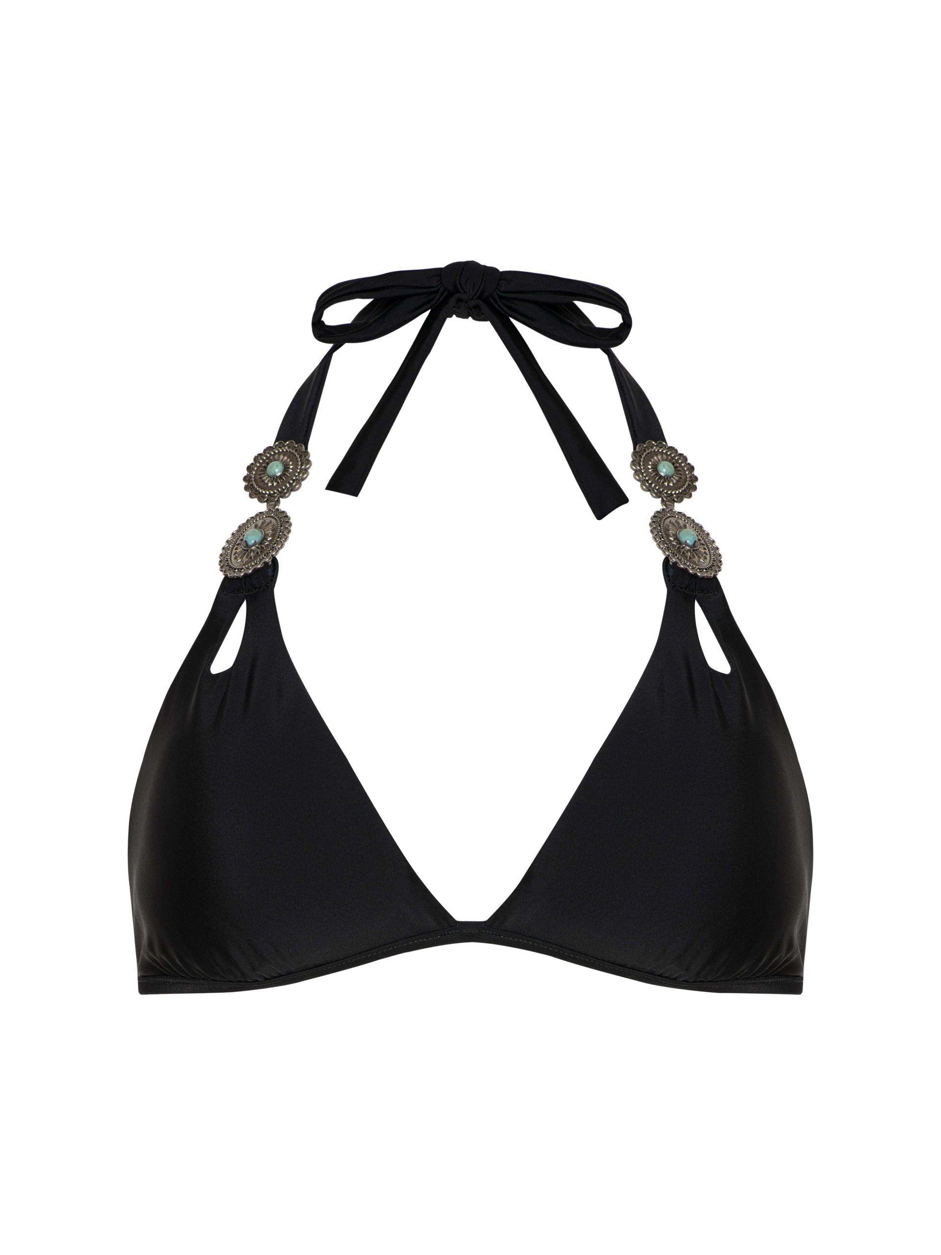 Our classic black triangle bikini top, now with subtle cutouts and silver and turquoise embellishments.