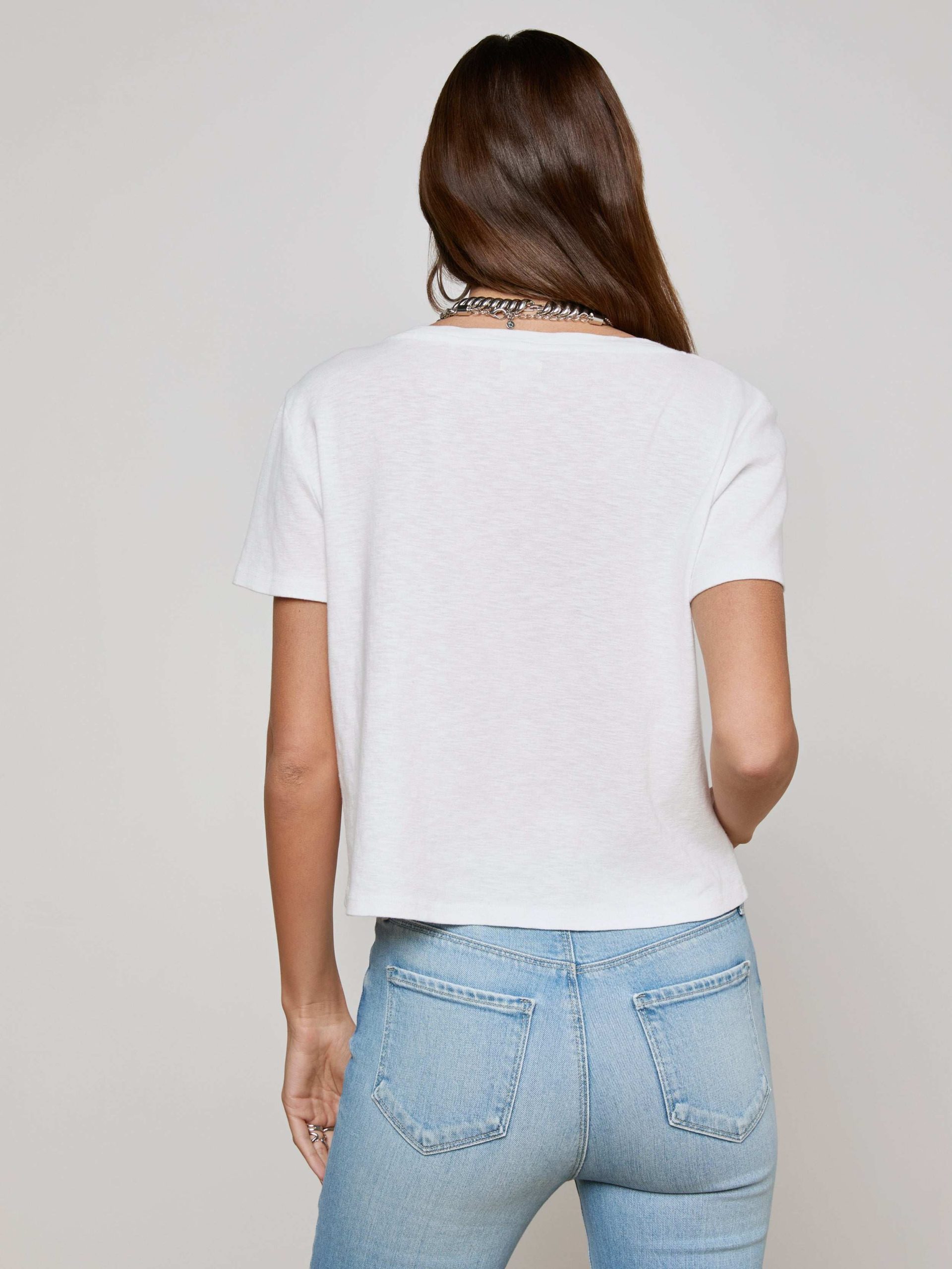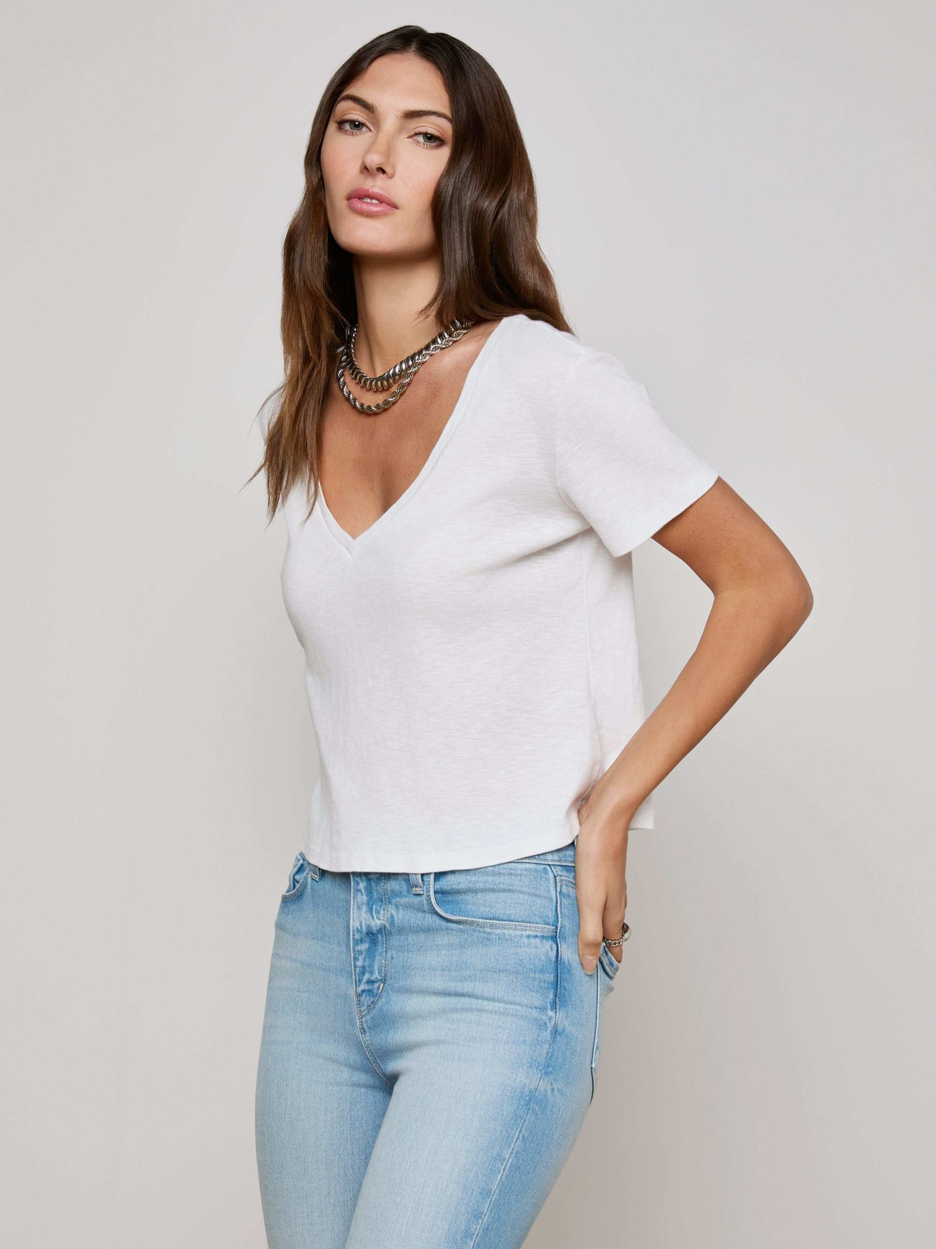 This lightweight cotton tee features a relaxed fit and classic V-neckline. It’s the perfect little vintage-inspired tee—effortless and versatile.