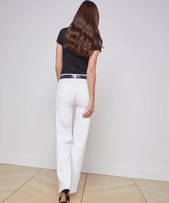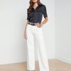 A beautifully proportioned wide-leg high-rise jean in white premium stretch denim. Contoured waistband fits securely at or below natural waist, while supple stretch denim hugs the hip before releasing into a wide leg. Classic five-pocket construction and front zip fly closure with tonal button. Style No. 2790KBO-BLAN