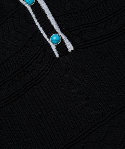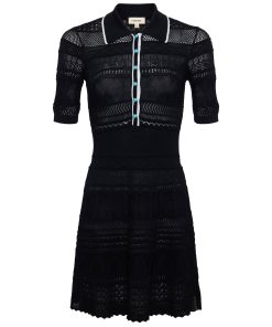 Feminine and refined, the Dakoa is a fit-and-flare dress, featuring a mix of knit patterns for texture and dimension. A waist-defining ribbed panel creates a flattering silhouette, while contrast turquoise buttons add visual interest.