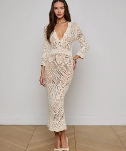 Beach days, evenings on the yacht, seaside cocktails–the Dovie knit dress is your answer to every activity near sand and saltwater. Featuring a deep V-neck and scalloped trims, it’s perfect as a flattering cover-up or layered over tonal pieces.