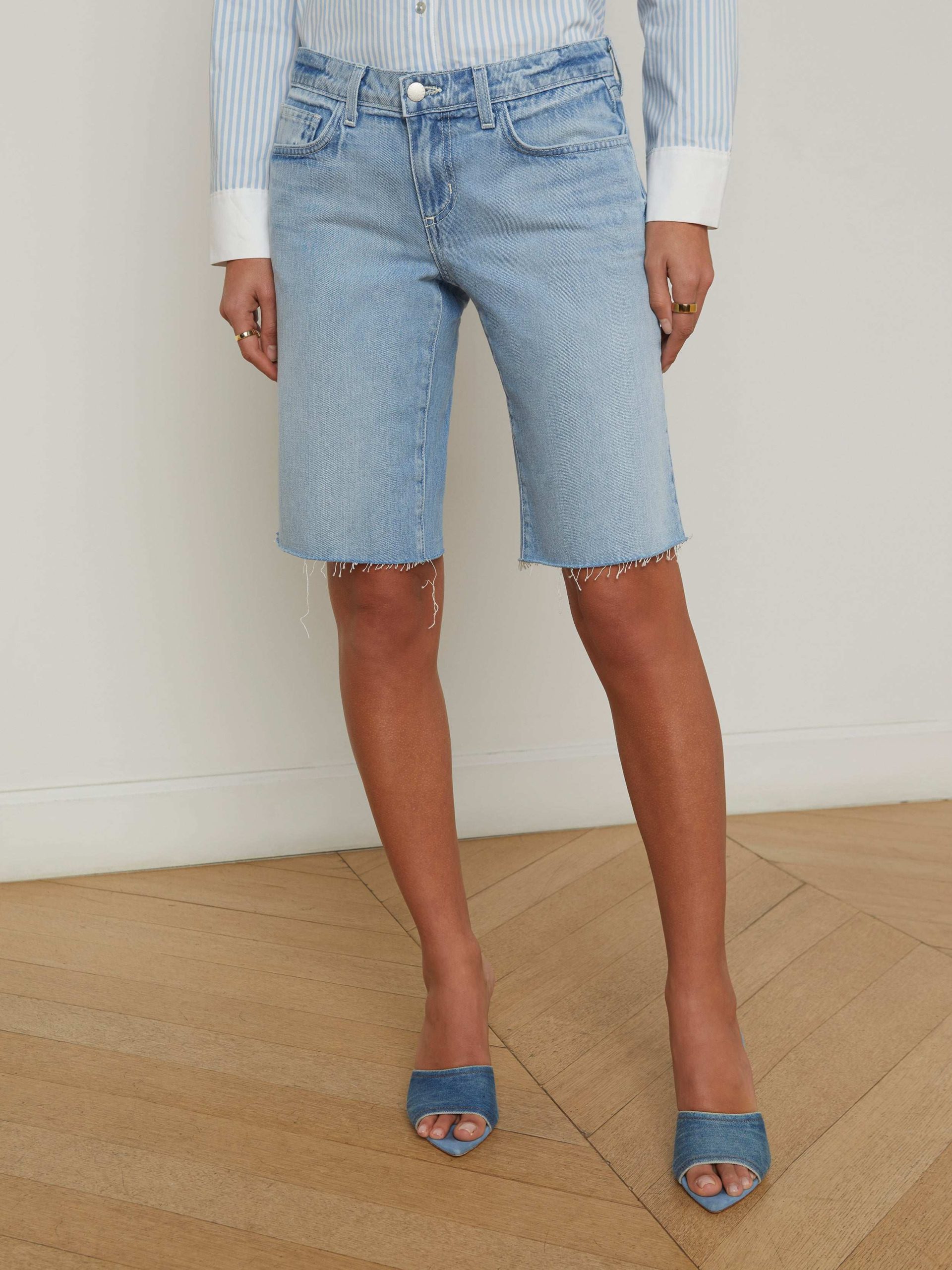 Your coolest denim short is the low-rise Elise. This style sits at the hip and features a relaxed fit that hits just above the knee.