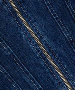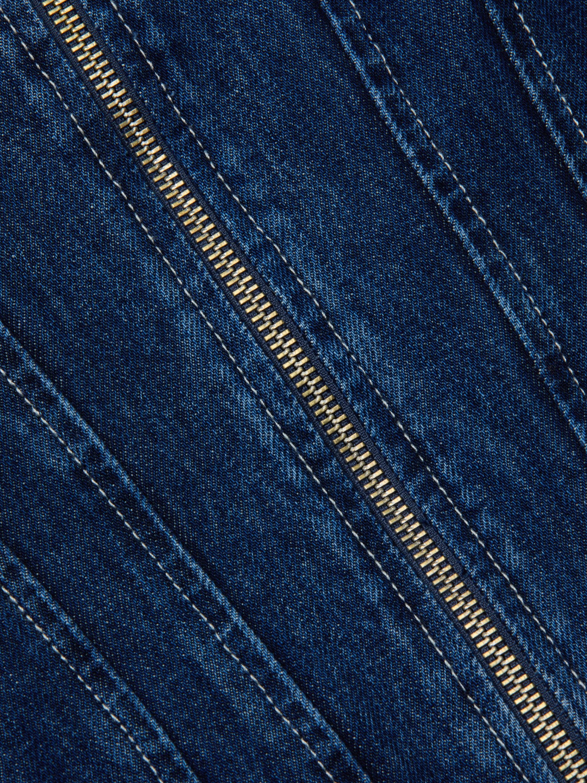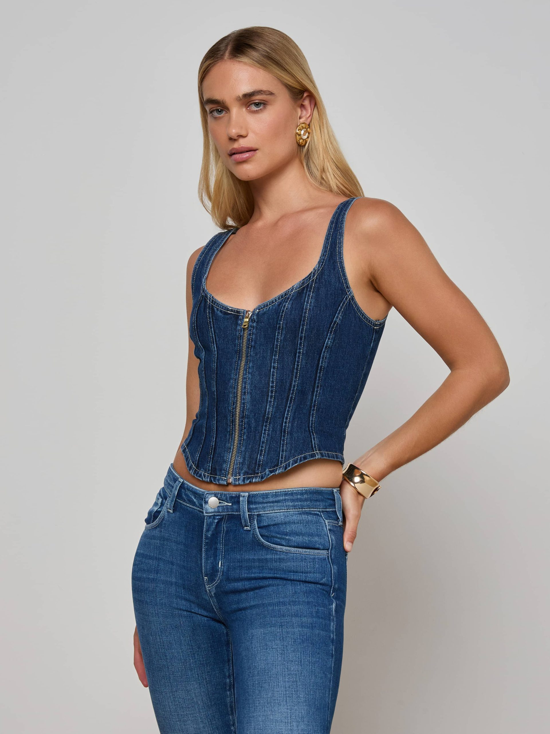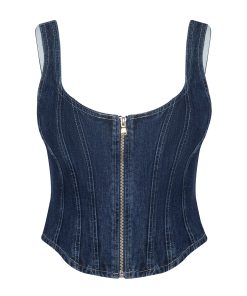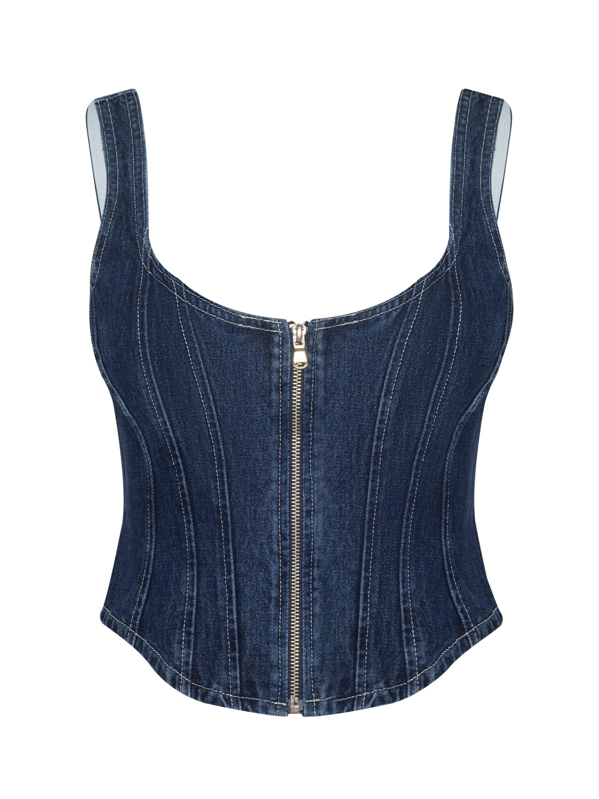 The Elysia is a structured corset tank crafted from 100% cotton denim, featuring a scoop neckline, contoured seaming, and a bold front zip closure. Designed with a flattering, sculpted silhouette.