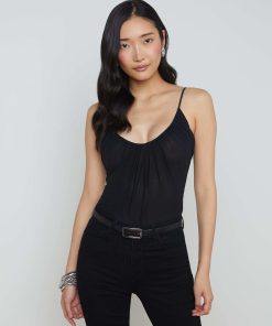 This subtly sexy bodysuit in black belongs in your wardrobe for all four seasons. Ruching adds feminine softness to a deep scoop-neckline. Adjustable straps allow for a fully customizable fit. Stunning on its own with slim denim. Layer under a full suit for a sharp office look. Style No. 40615PRM-BLAC