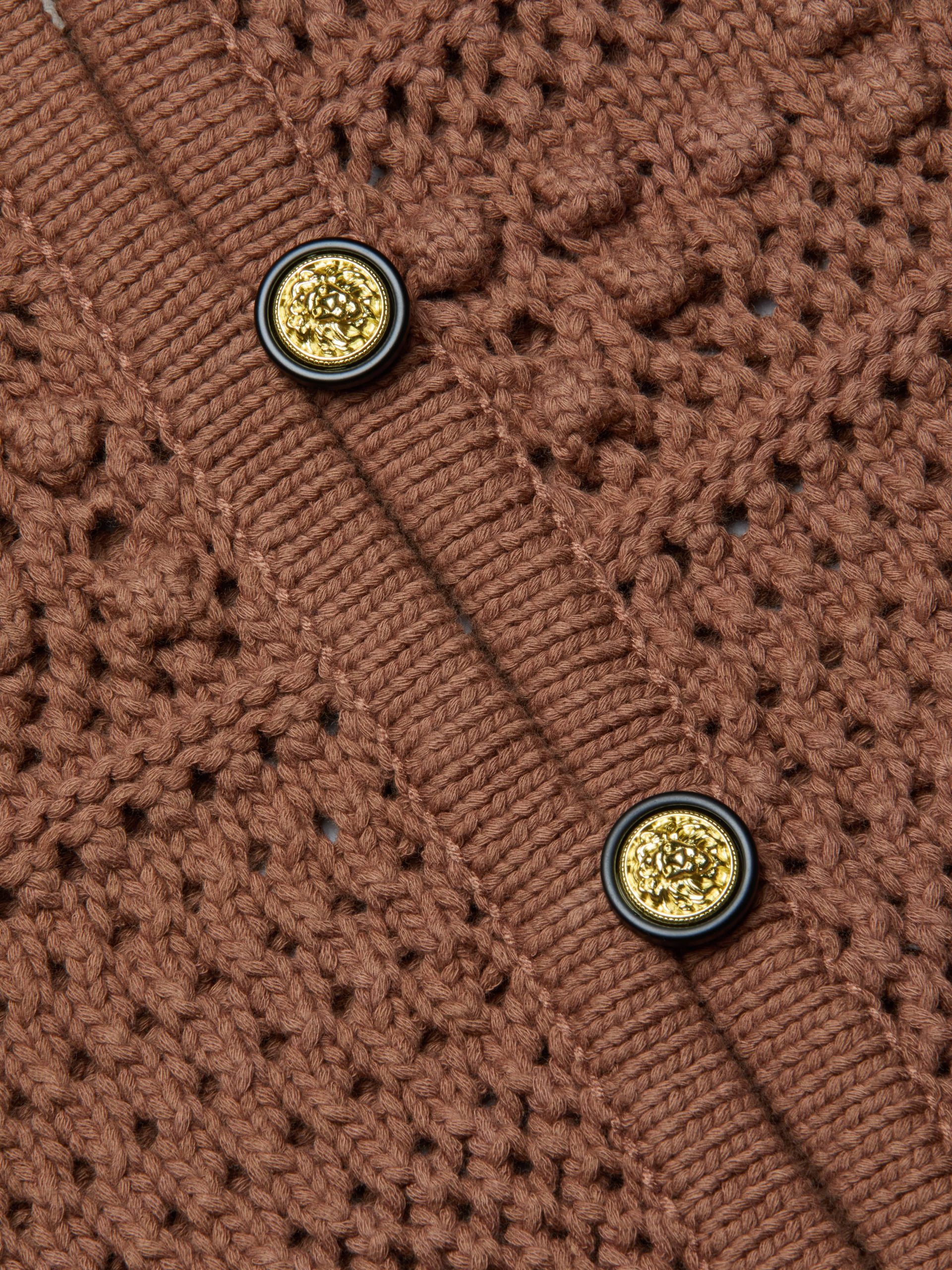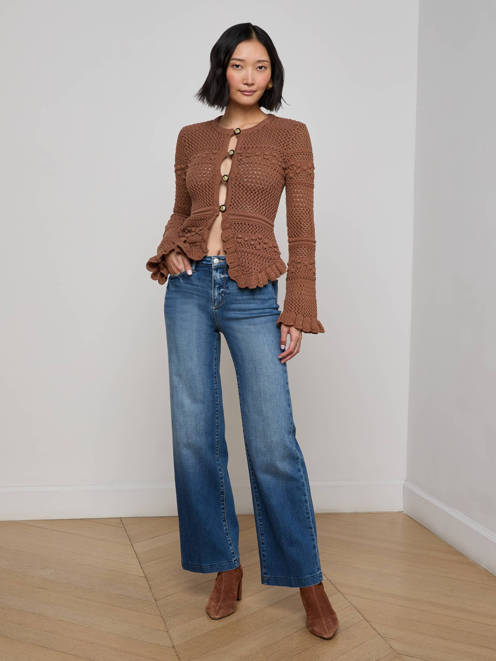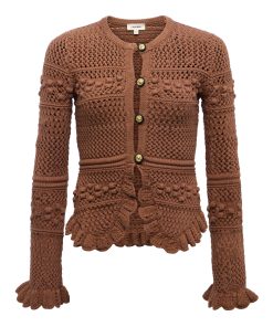 A ruffled cardigan with rich texture and charm, crafted from an open-stitch knit with statement buttons, and playful scalloped hems. Romantic, cozy, and perfect for layering with anything and everything.