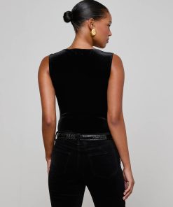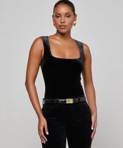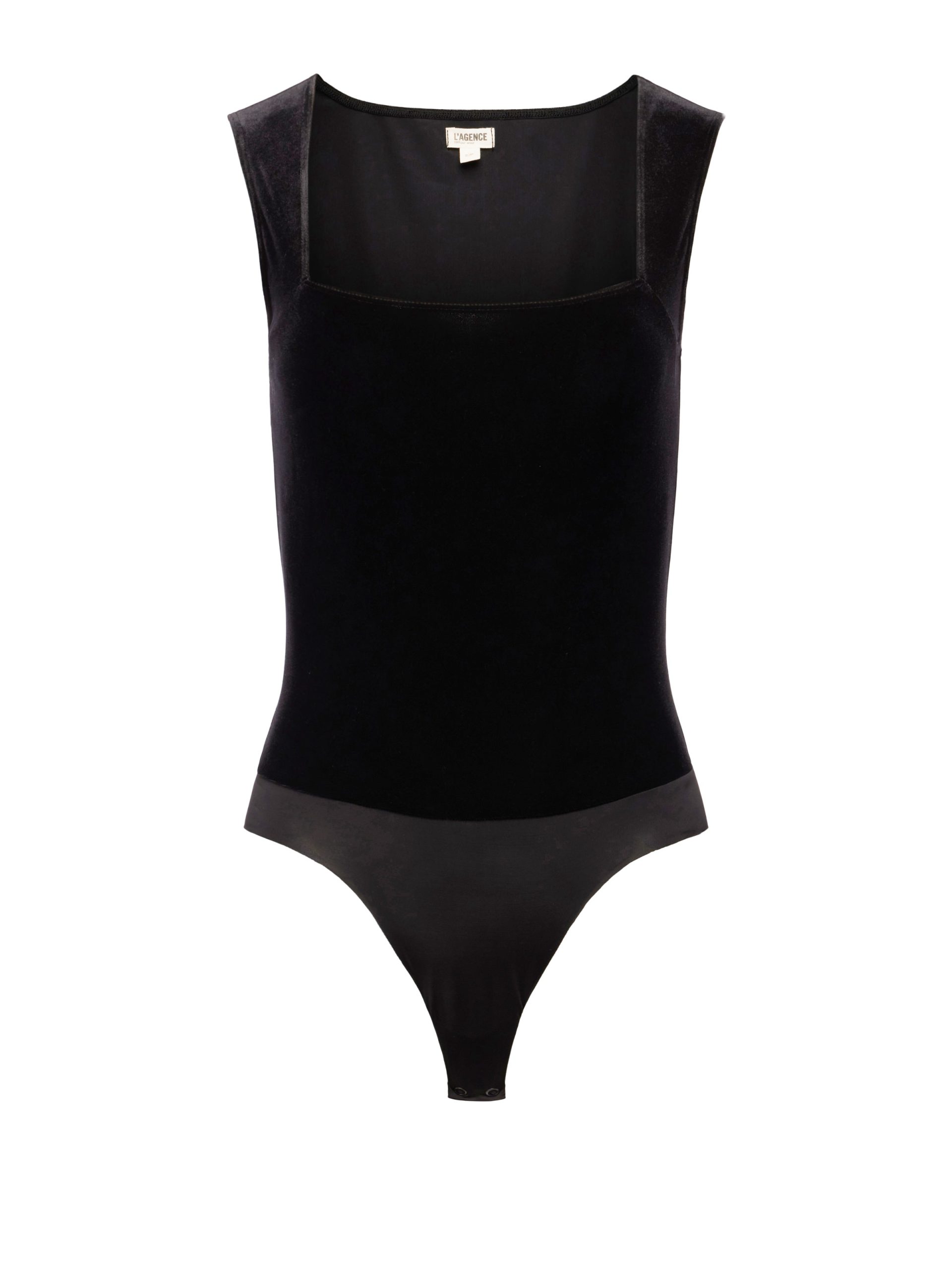 A sleek tank bodysuit in true black. Front square-neck style frames collarbones beautifully. Luxurious stretch velvet hugs curves before extending into a cheeky laser-cut panty that fastens with a two-snap gusset, creating a smooth, line-free look. Sophisticated on its own, it also makes a perfect layering piece under a jacket. Style No. 5637FUW-BLAC