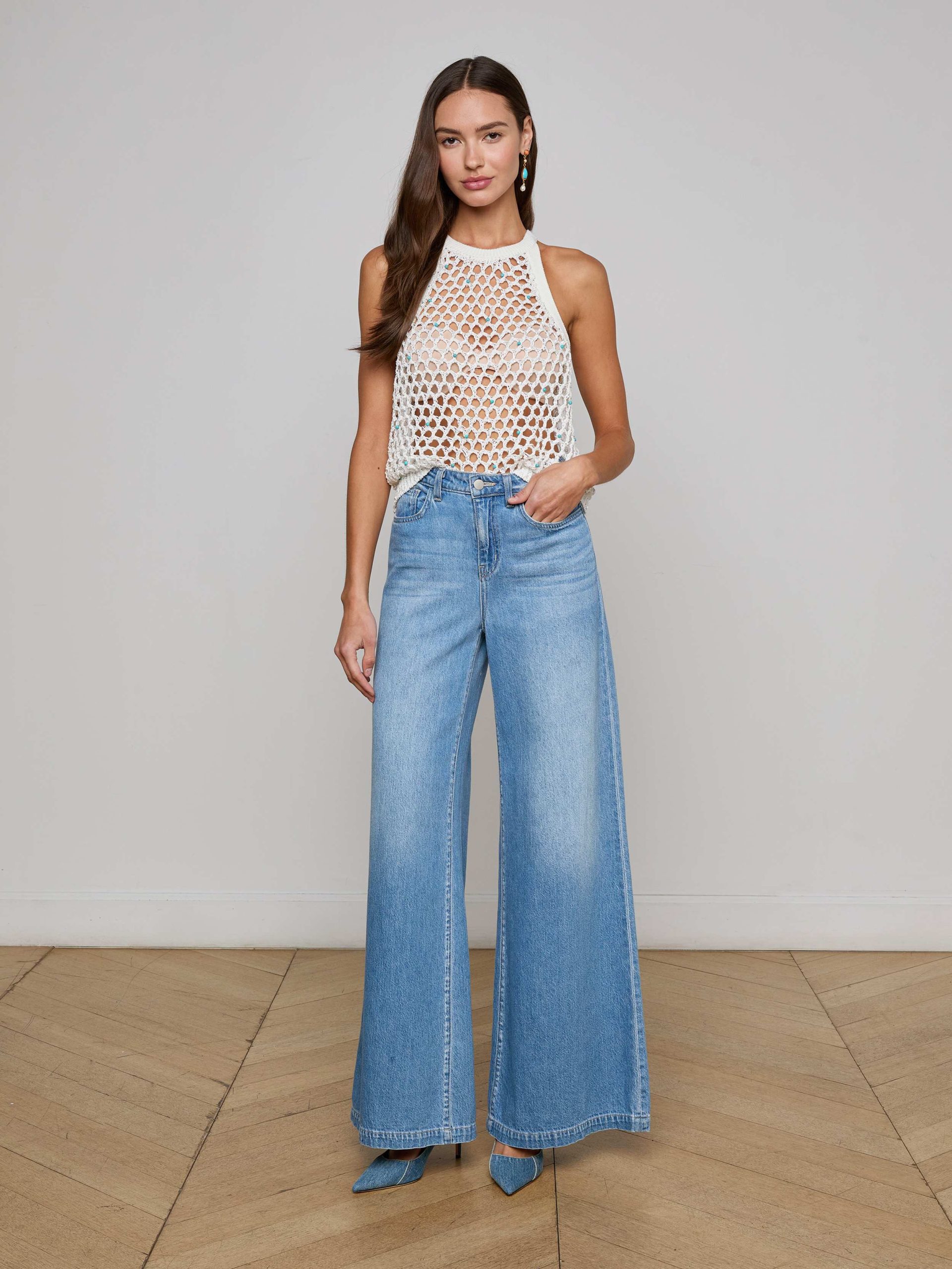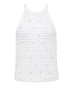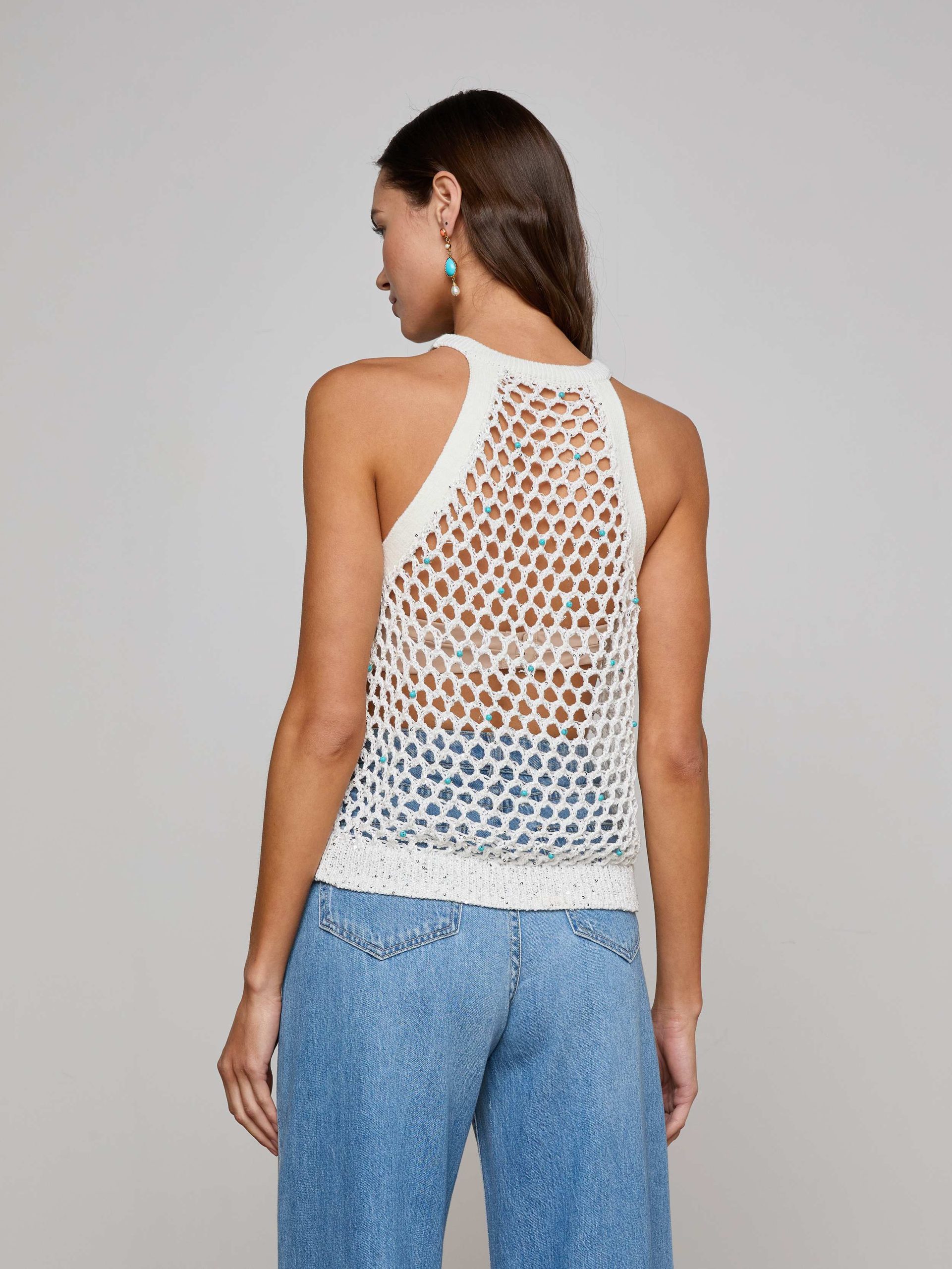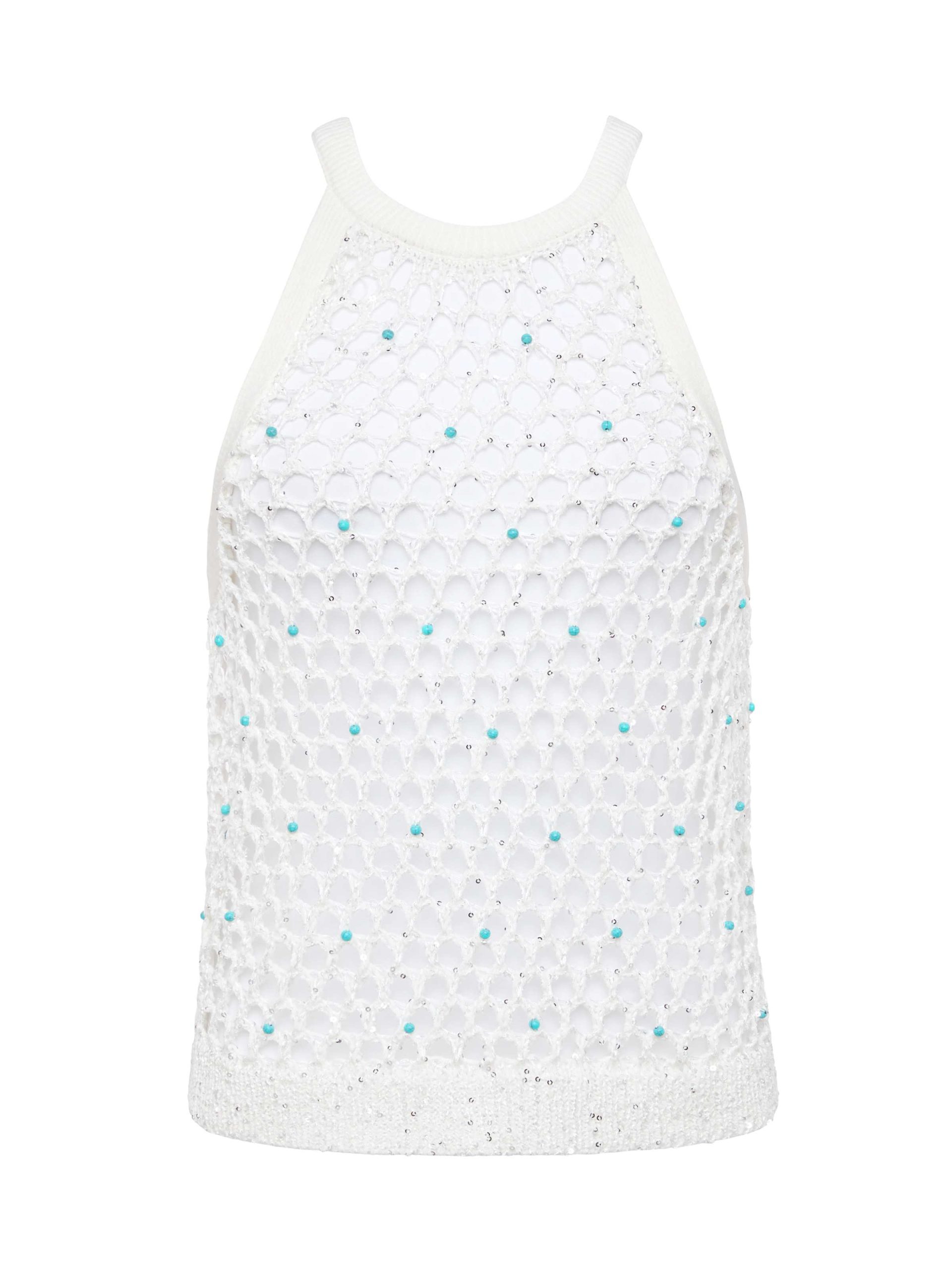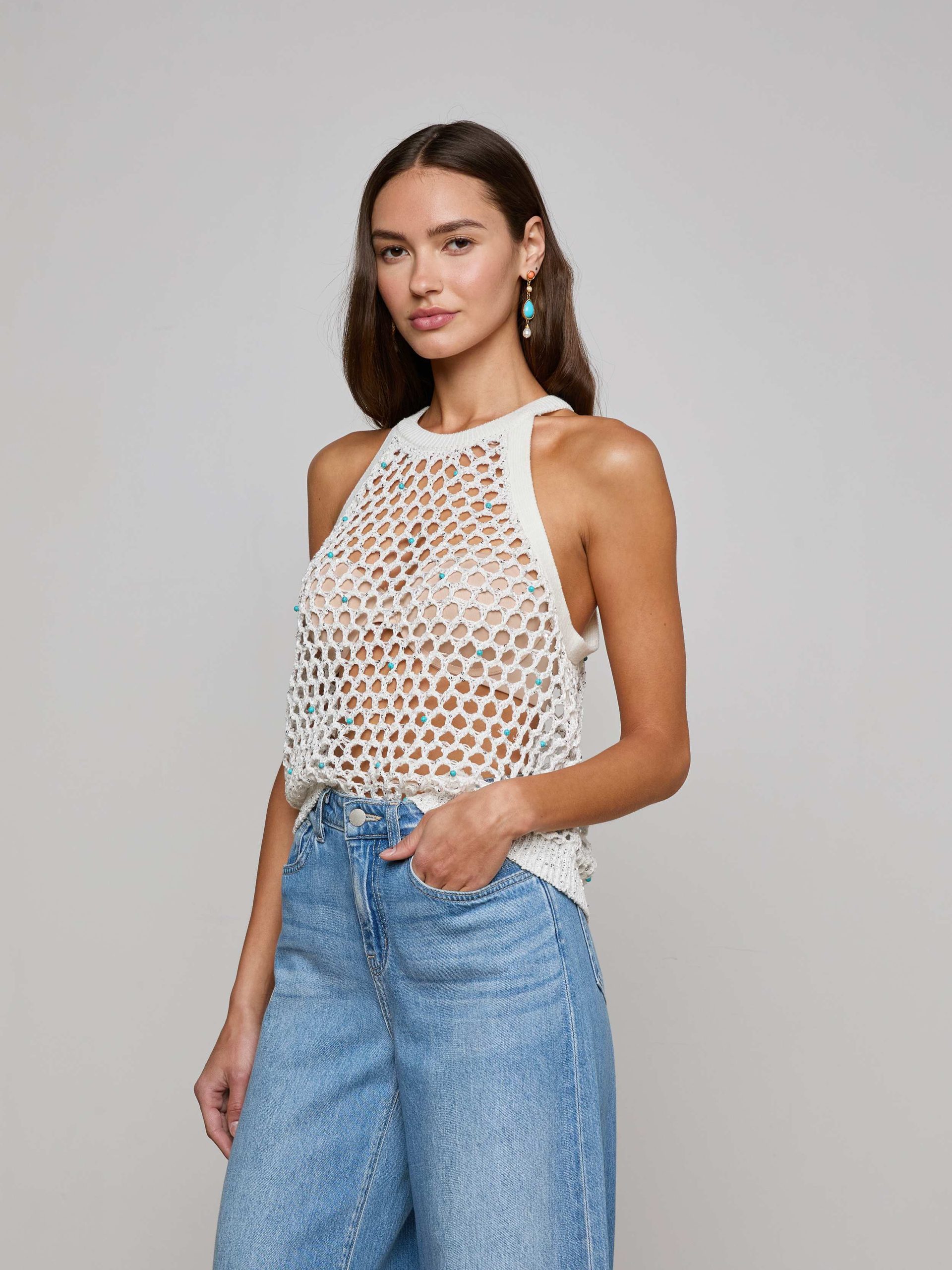 Complete your summer look with the Parmida—a crochet knit tank, featuring a large-scale diamond mesh pattern with delicate turquoise bead accents. We love this tank for beach days to nights out.