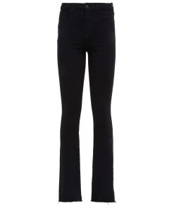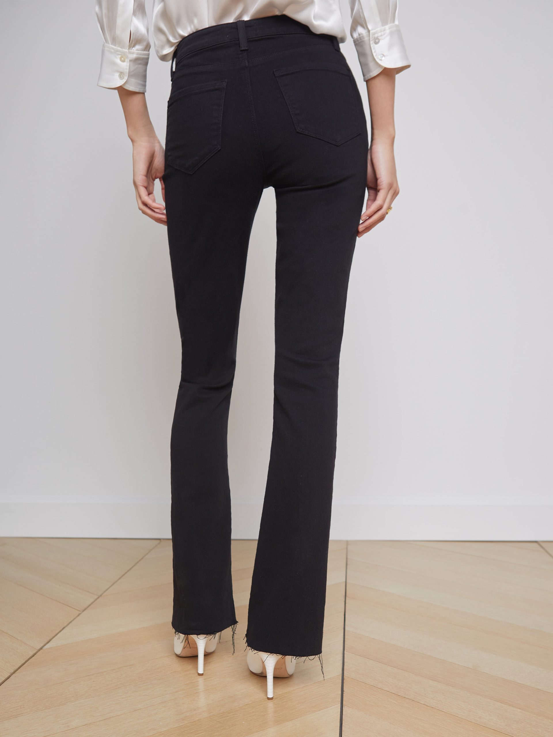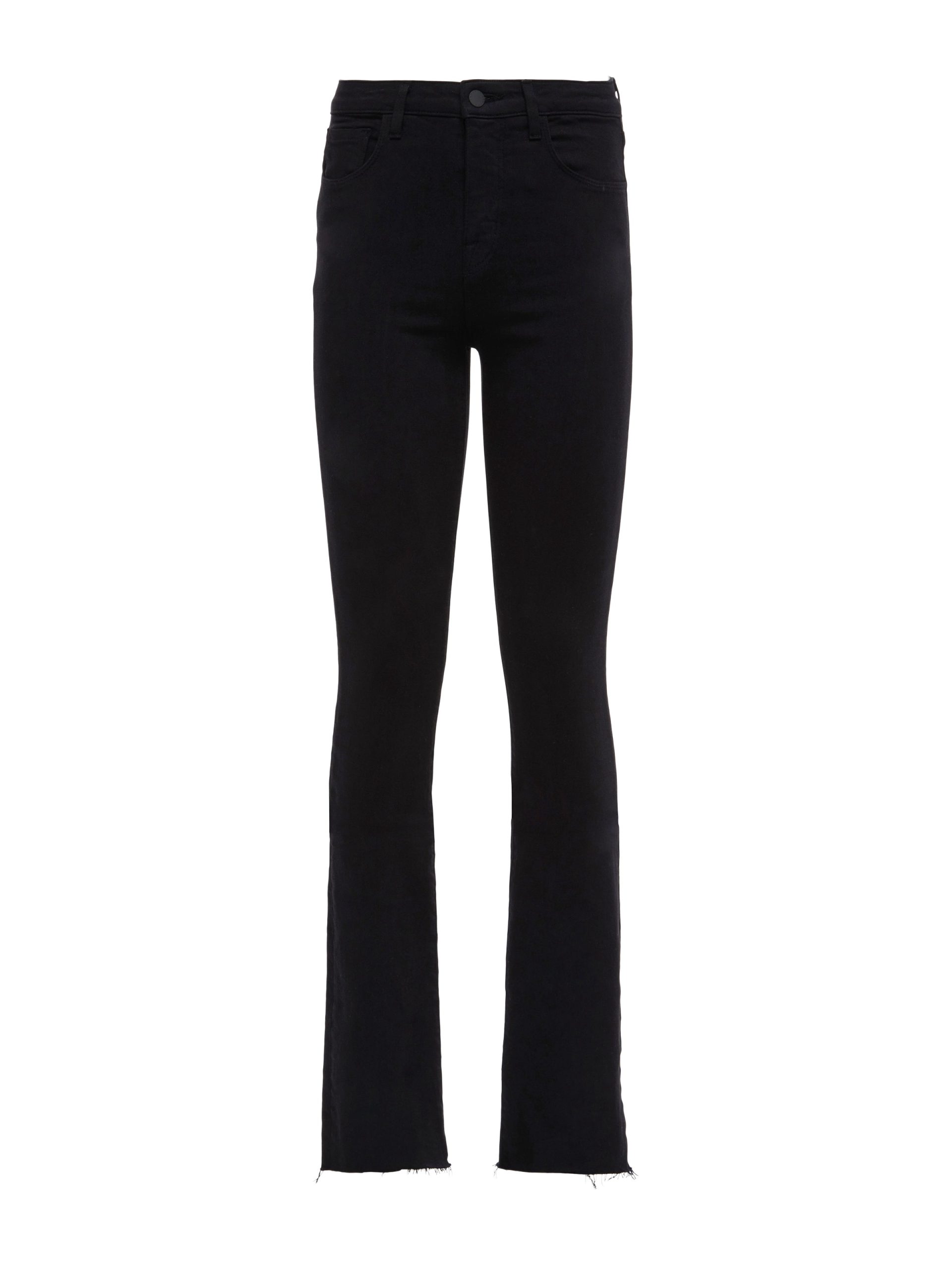 A classic high-rise jean in a black premium stretch denim. With a flattering contoured waistband, style is fitted through hip and thigh before falling in a straight leg to a clean raw hem. Includes five-pocket construction and front zip fly closure. This style is thoughtfully designed with a raw hem for easy alterations. Style No. 2649ISKR-BLAC
