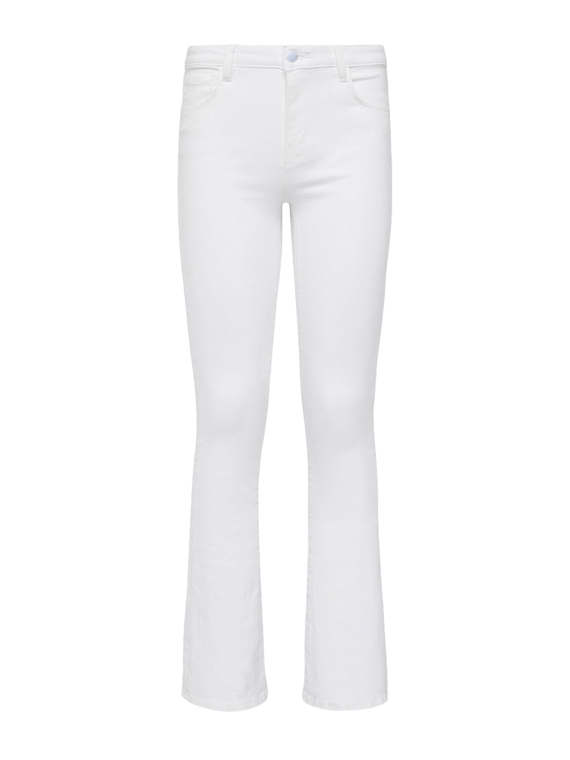 A classic high-rise jean in white premium stretch denim. Contoured waistband fits securely at the natural waist, while the design hugs from hip to knee before releasing into a slim bootcut hem. High-recovery denim holds its shape, smoothing the figure without sacrificing comfort. Classic five-pocket construction and zip fly closure. Style No. 2700PDD-BLAN