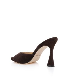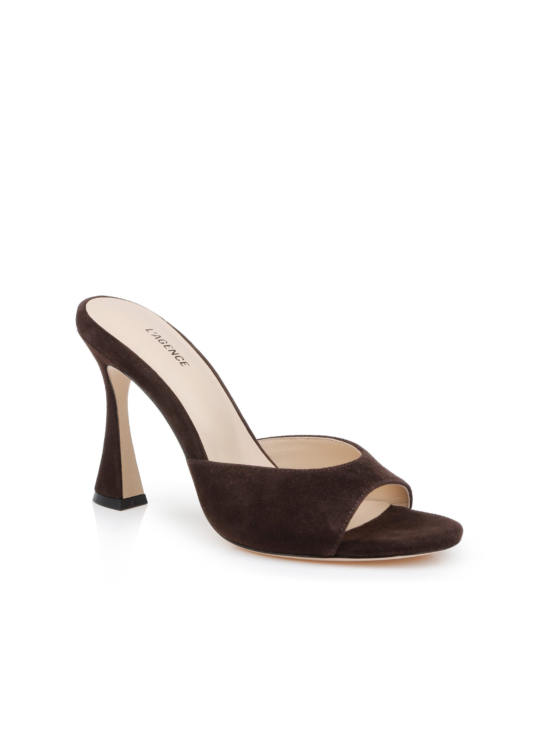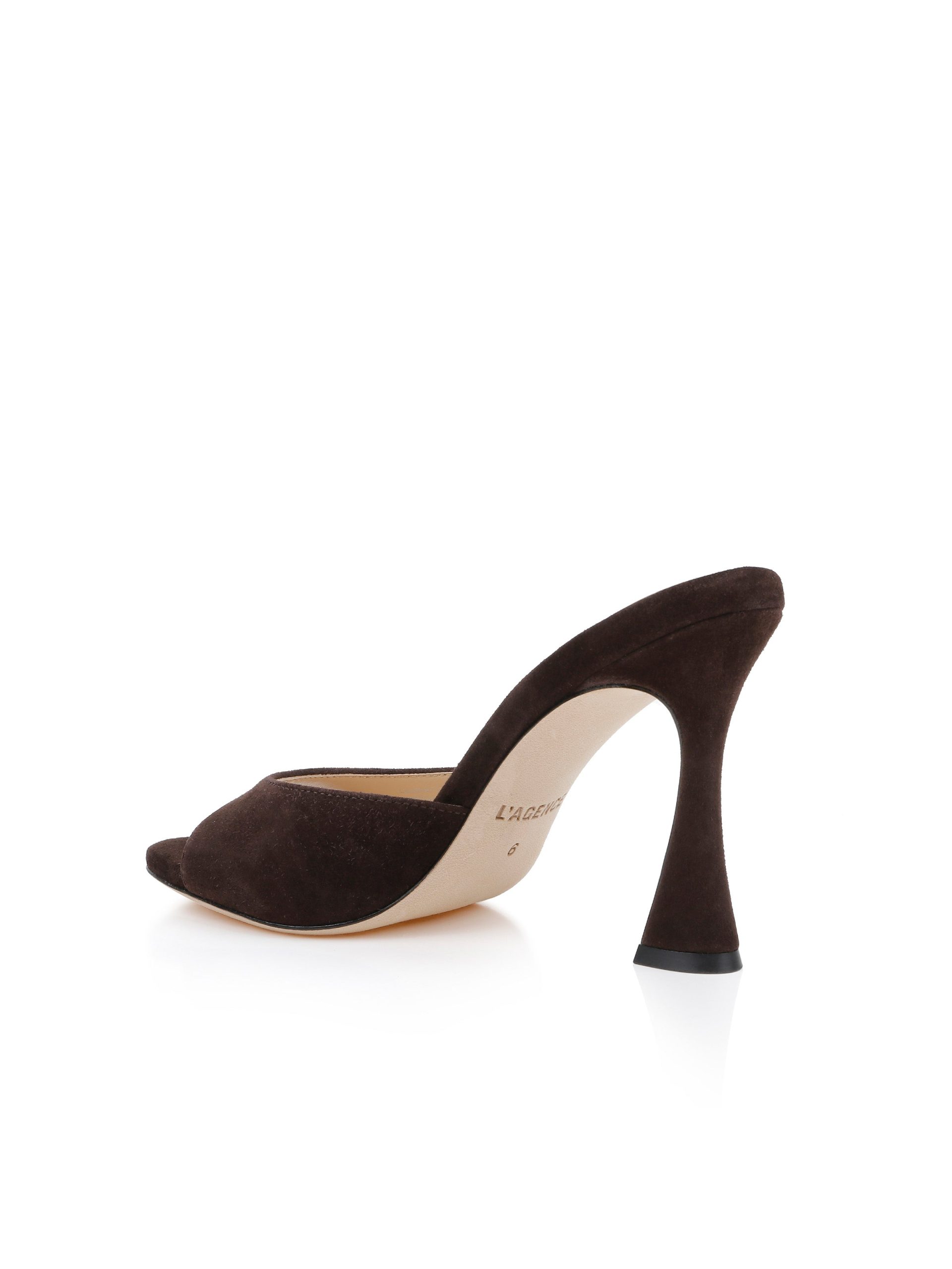 Our signature open-toe mule constructed with a subtly flared heel. Now updated in dark brown suede.
