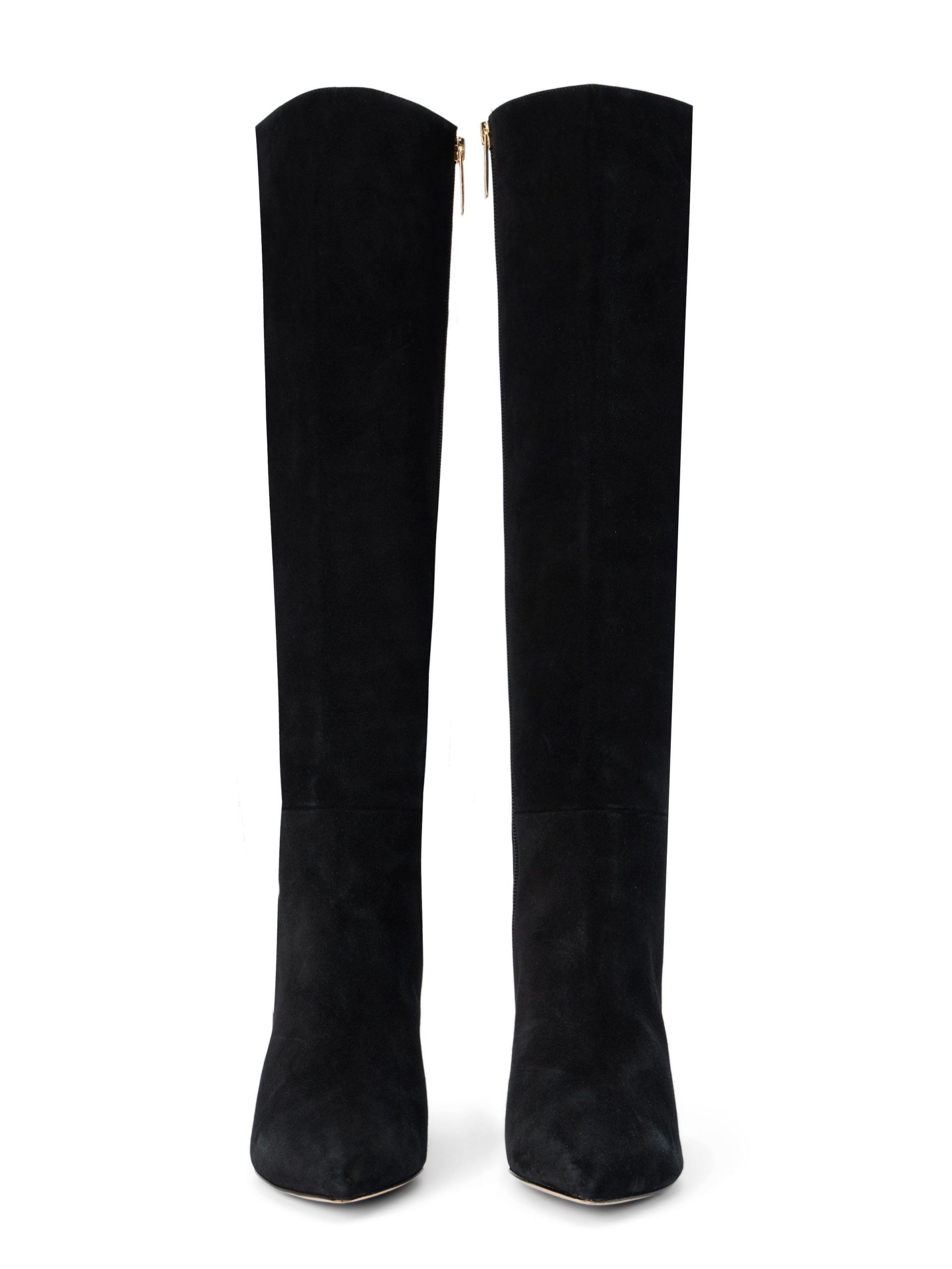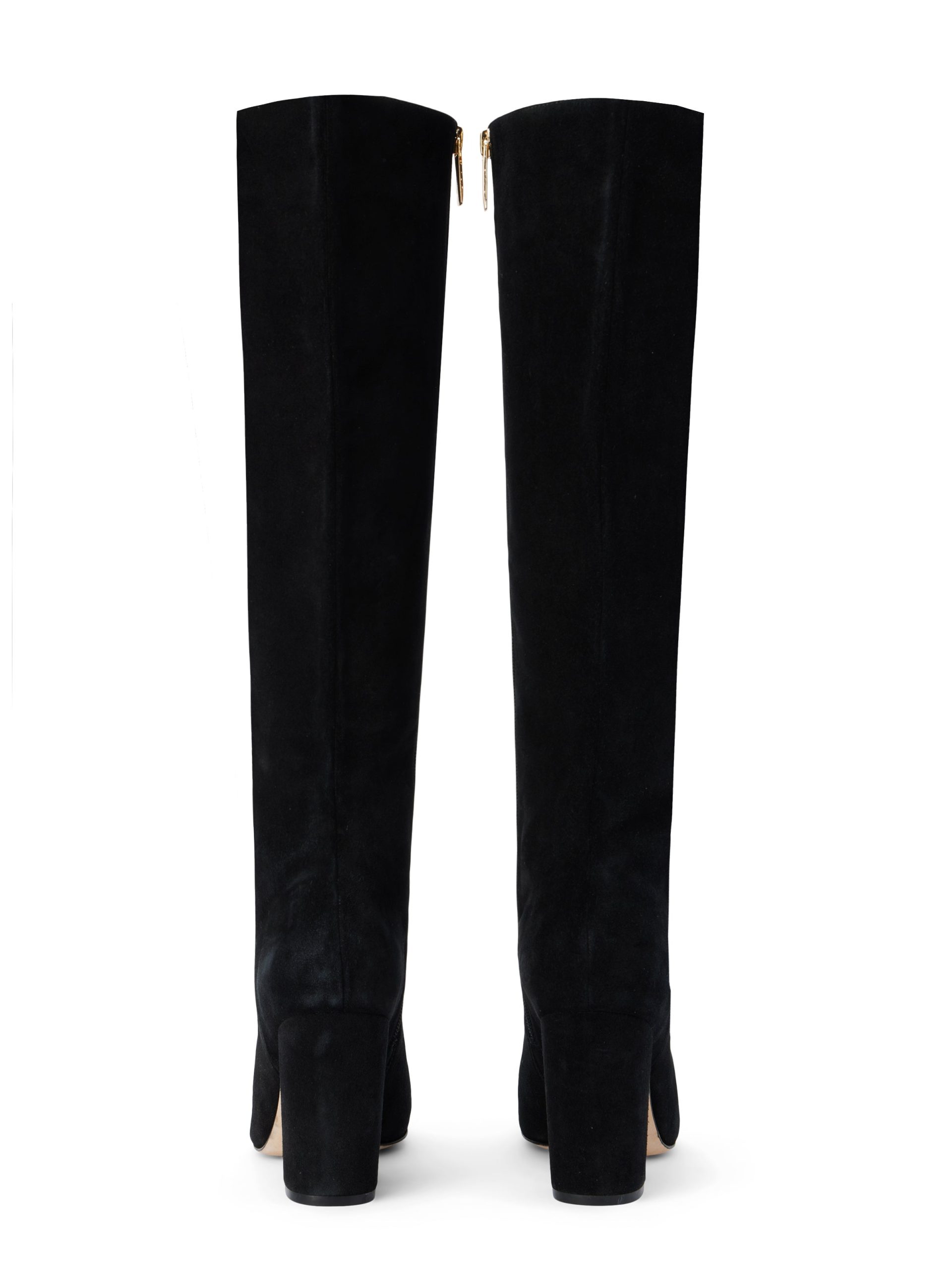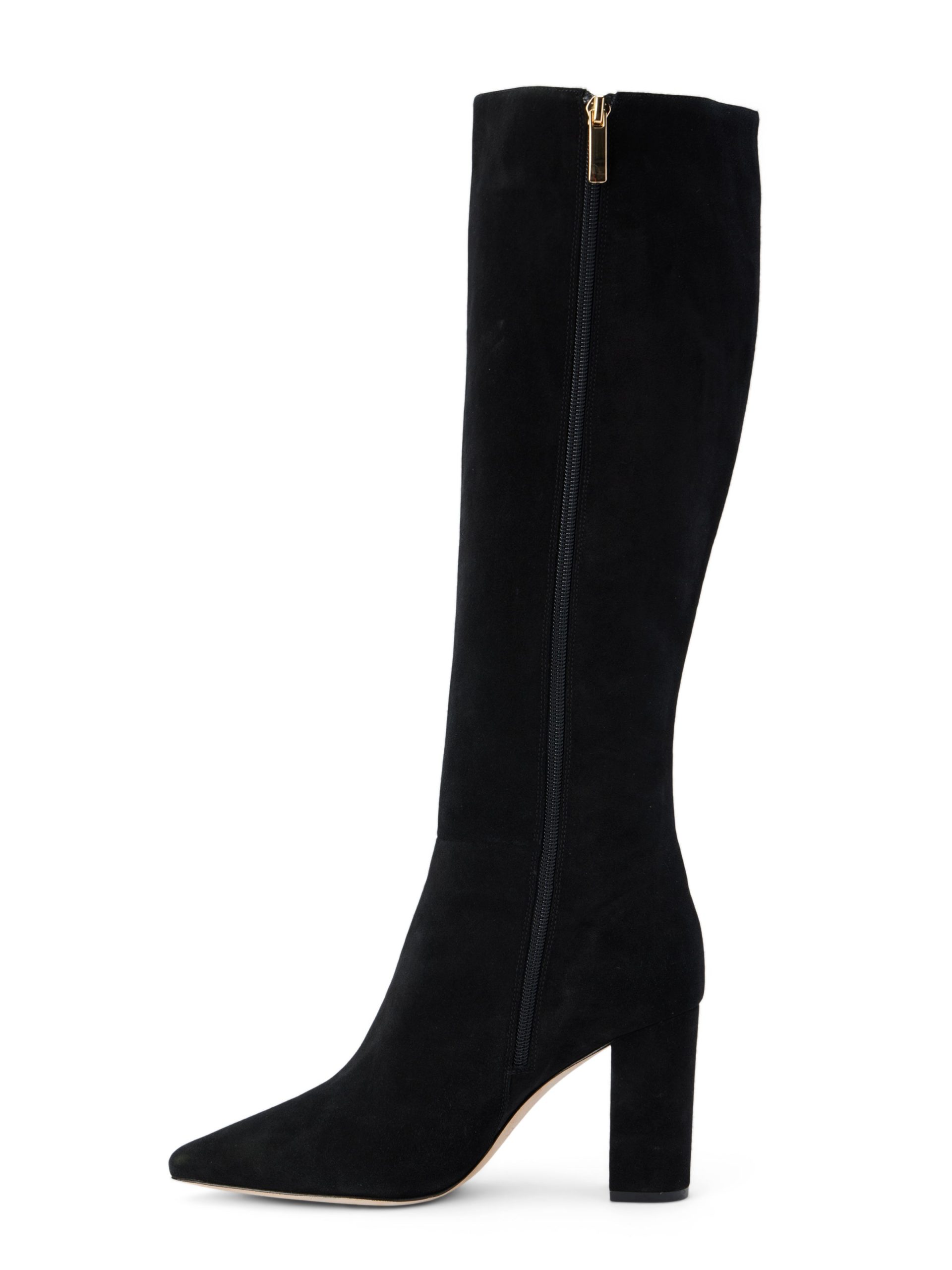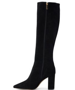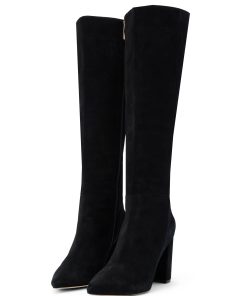 The quintessential knee-high pointed-toe boot in black suede. Impeccably crafted suede molds to flatter the foot and calf in an elegant, timeless silhouette. Wearable block high heel is ultra-versatile, pairing effortlessly with denim, leggings or skirts. Zip closure. 100% Suede. Style No. 9TILA1253-BLSU