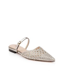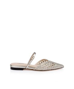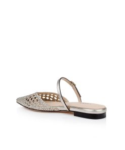 The Jacklyn is a pointed-toe flat mule, ideal for easing into warmer weather. A woven leather upper adds breathability, while a sleek strap gives it support and a polished finish. In gold leather.