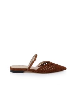 The Jacklyn is a pointed-toe flat mule, ideal for easing into warmer weather. A woven suede upper adds breathability, while a sleek strap gives it support and a polished finish. In brown suede.