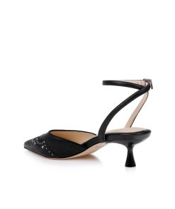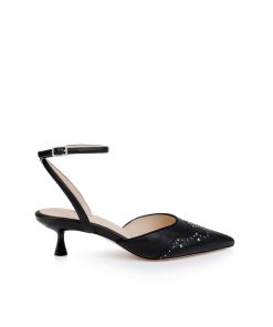 A chic kitten heel and delicate ankle strap give elegance to the Liana, while Western-inspired stitching and stud detailing add subtle edge. In black leather.