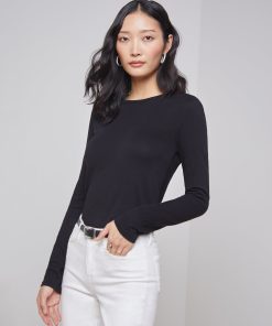 A form-fitting, long-sleeved crew neck tee in rich black. Crafted from soft and stretchy luxe microfiber, Tess features a high crew neck, long sleeves, and a smooth, lean fit. Style No. 5491MJT-BLAC