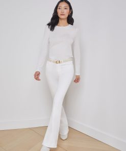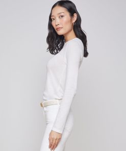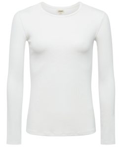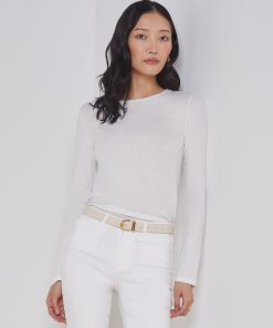 Modern and elegant slim-fit top in white. Ultra-soft microfiber jersey has a luxuriously silky hand and clings lightly to the figure. Look includes crew neck and sleek long sleeves. Beautiful wardrobe stable that works on its own or as a base layering piece. Style No. 5491MJT-WHIT